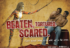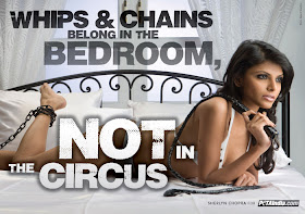 If you think locking your baby in a room is cruel, you may want to believe in letting birds and dogs be cage- free as our very own John Abraham suggests , if you want to be a Lara Dutta, you may want to consider vegetarianism( forget imagining how you would look in the lettuce gown!), and if you still want to see the elephants, who most superstitious people believe bring you good luck, then you may want to break the shackles and prevent abuse. A series of print ads, featuring the who's who of Bollywood, very aptly combined with a theme that depicts what they are famous for : Yana Gupta – item numbers, Rakhi Sawant – whipping the men, Sherlyn Chopra – Sensuous drama, Gulshan Grover – Villian roles and the other interesting combos.